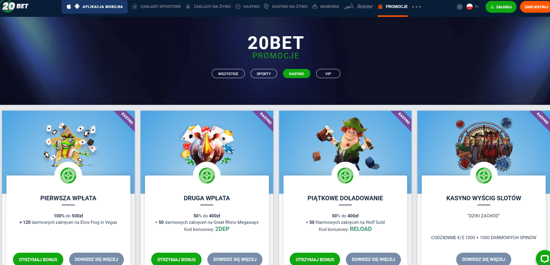W 20 Bet znajdziesz szeroka ofertę bonusową, skierowaną zarówno do graczy kasyna online, jak i tych zainteresowanych zakładami bukmacherskimi. Poniżej przyglądamy się tylko promocjom kasynowym. Pamiętaj, żeby promocje i ich zasady zawsze sprawdzić też na stronie kasyna, ponieważ mogą one ulegać zmianie. Zasady bonusów są bardzo ważne, ponieważ ich niespełnienie skutkuje nie tylko utratą samego bonusu, ale także wszystkich wygranych, jakie z niego uzyskaliśmy.