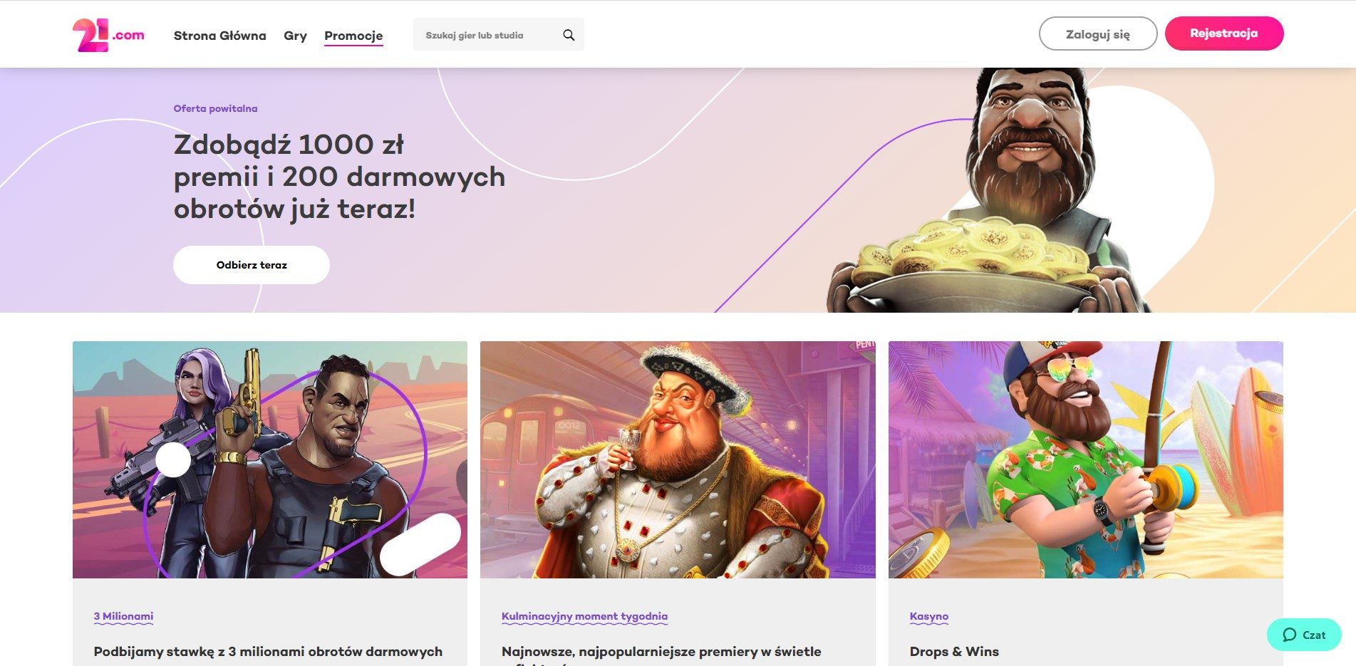 Promocje wraz z warunkami opisano w zakładce bonusowej 21.com sloty. Odnośnik do niej widnieje na stronie głównej platformy.