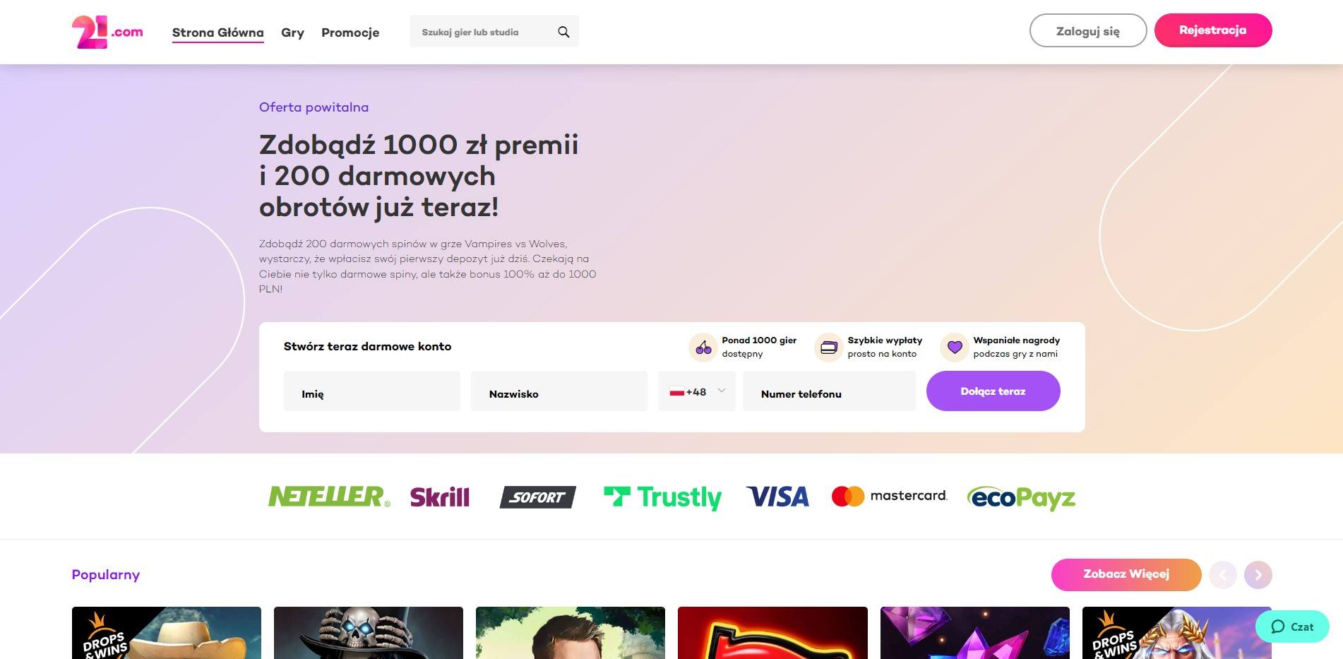 Jak doskonale widać, kasyno 21.com to kompletna platforma do gry dla każdego fana internetowych potyczek na gotówkę. Strona oprócz gier na kasę udostępnia też ich darmowe odpowiedniki, które oferują graczom zabawę wśród oficjalnych gier z opcją ich testowania i treningu taktyki.