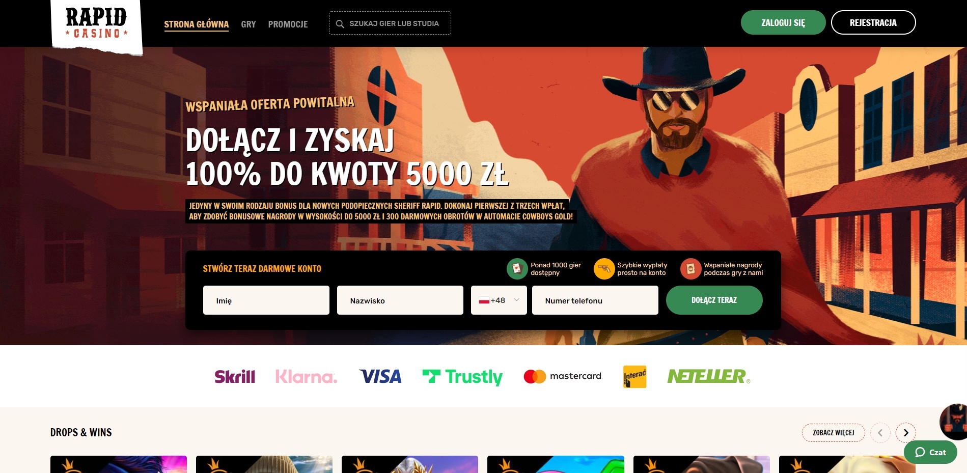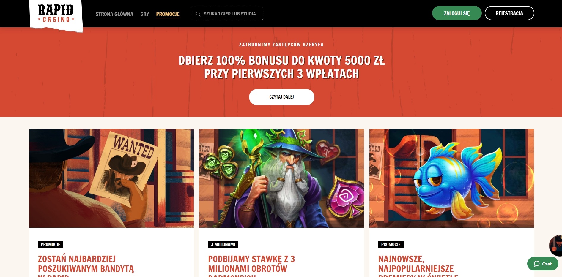 Rapid Casino, jak sama nazwa sugeruje jest szybkim kasynem online. Nie dziwi więc ich hasło “Najszybsza rozrywka w mieście”. Motyw graficzny oparty jest na dzikim zachodzie – świecie, gdzie pojedynki były na porządku dziennym, a ryzyko wpisane w życie. Rapid Casino podkreśla, że jest otwarte 24/7, dzięki czemu możesz zagrać w każdym momencie, kiedy tylko najdzie Cię na to ochota.